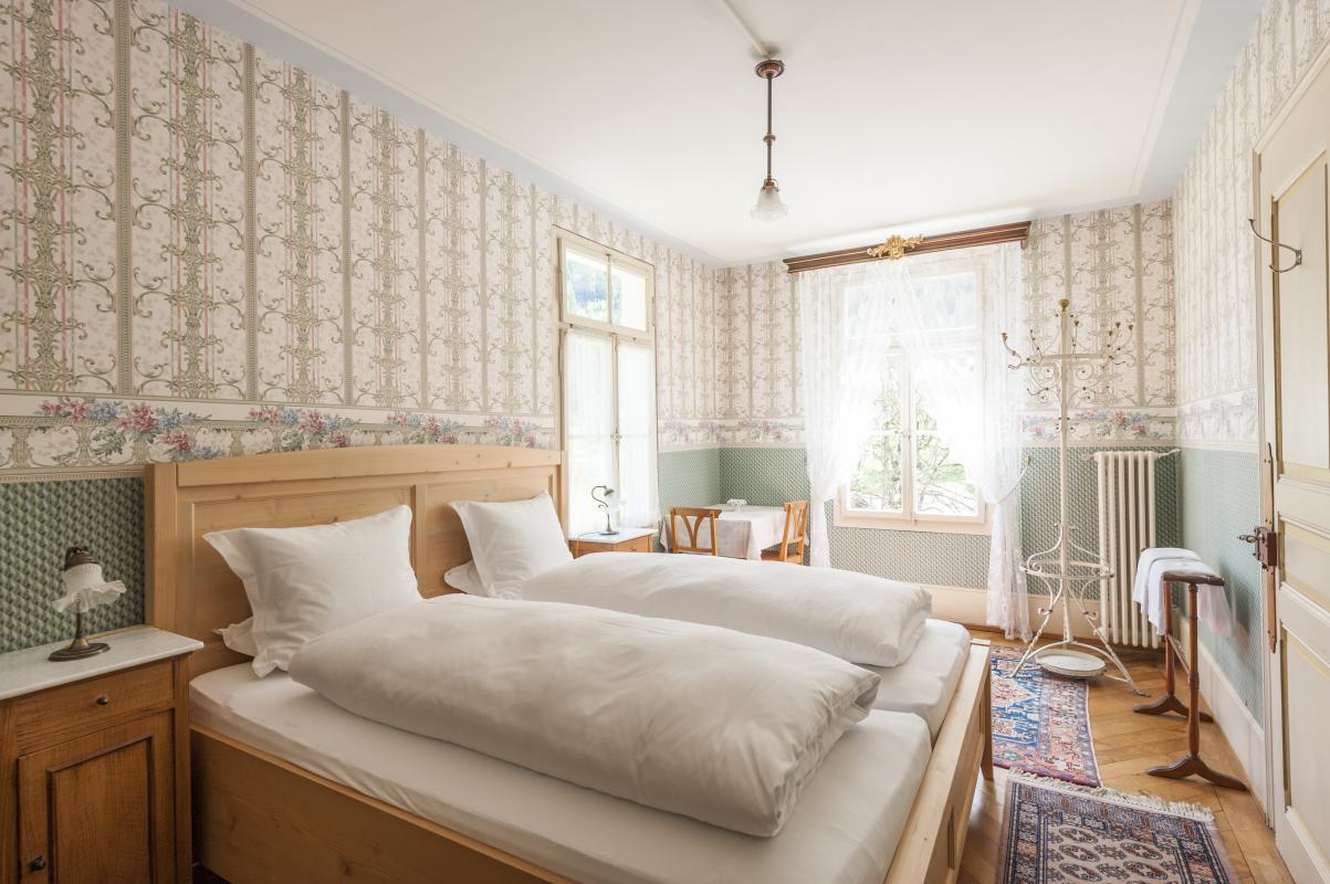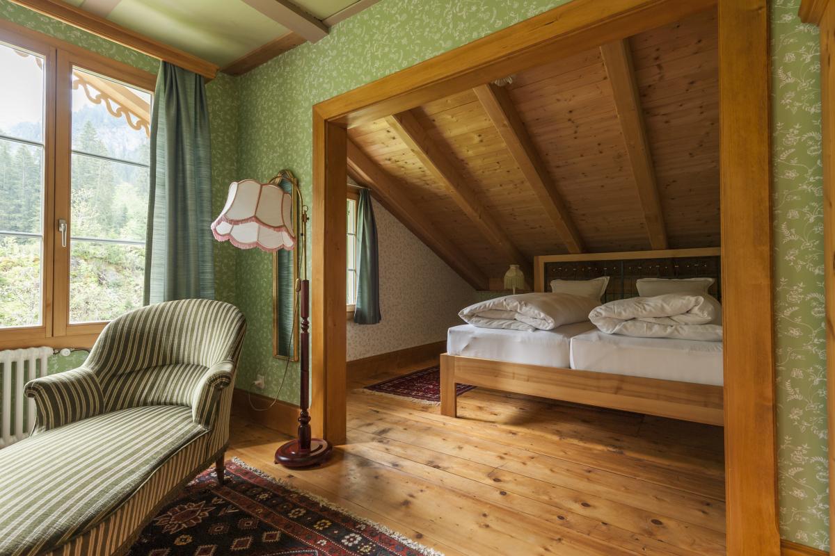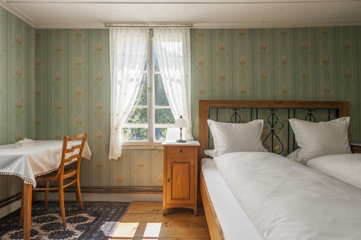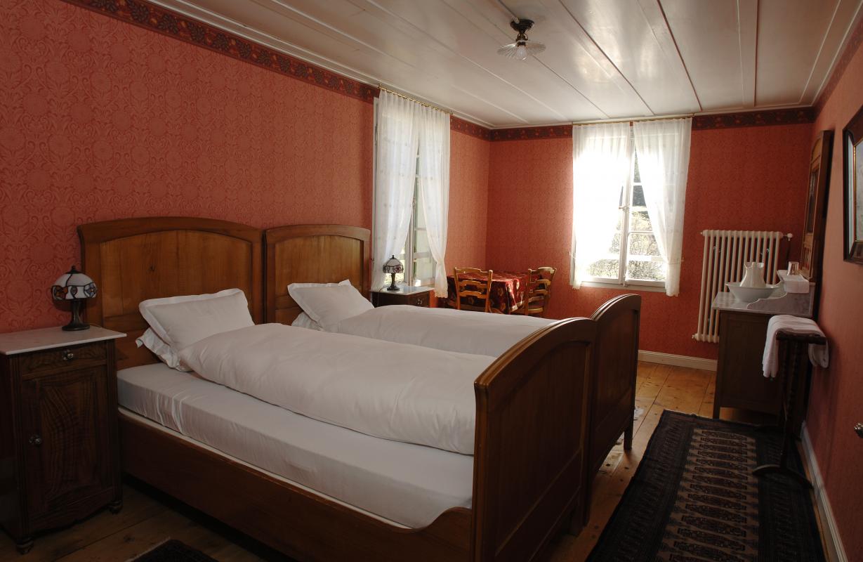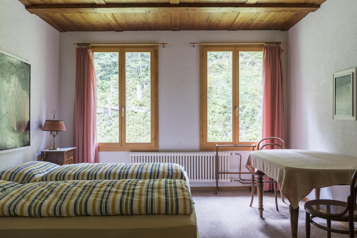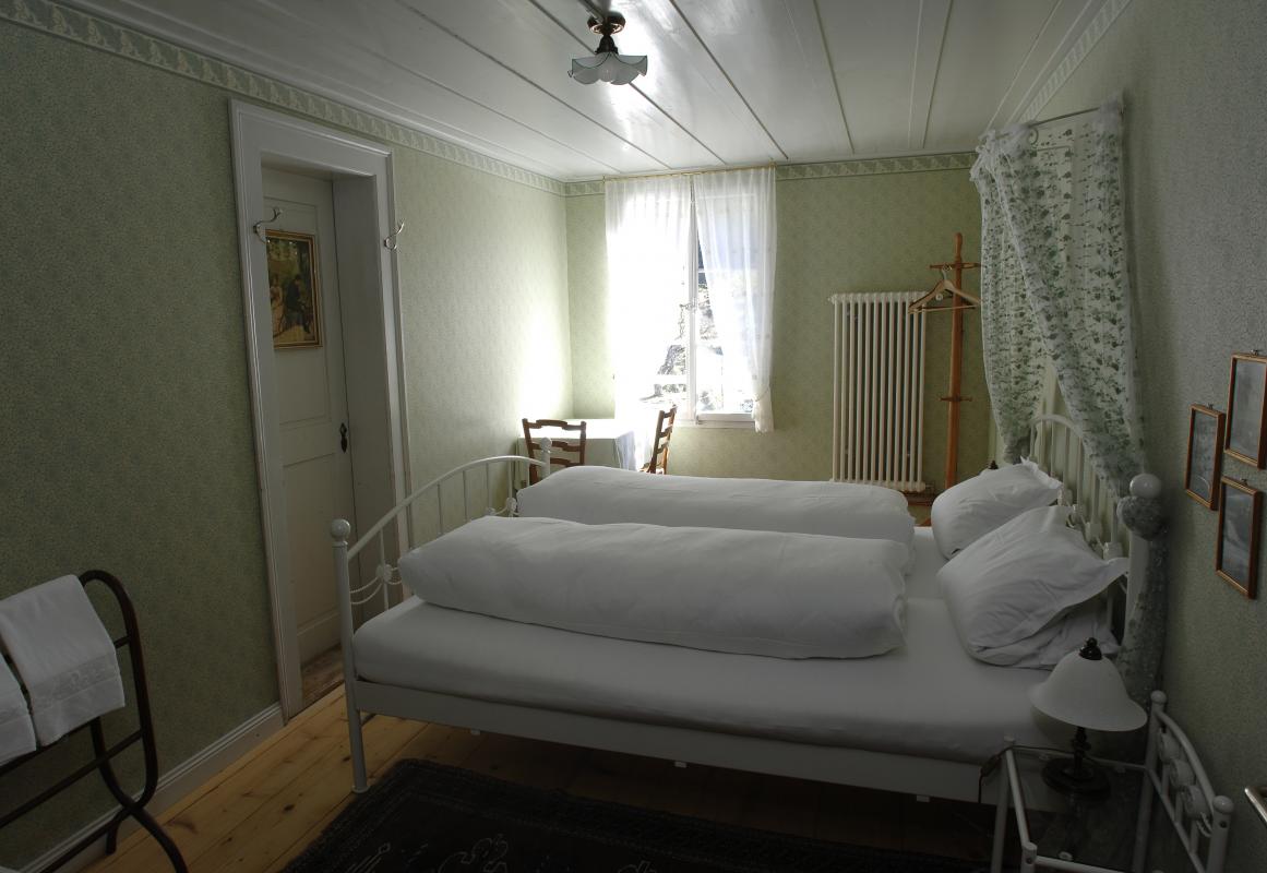 Simples chambres à deux lits sans vue sur les montagnes. Les draps ne sont pas changés après chaque séjour, veuillez apporter votre sac de couchage ou votre sac de couchage de cabane ainsi que vos propres serviettes de douche. Les toilettes et les douches se situent à l’étage. Ces prix comprennent le repas du soir, le petit-déjeuner et une carte libre parcours pour le car postal.