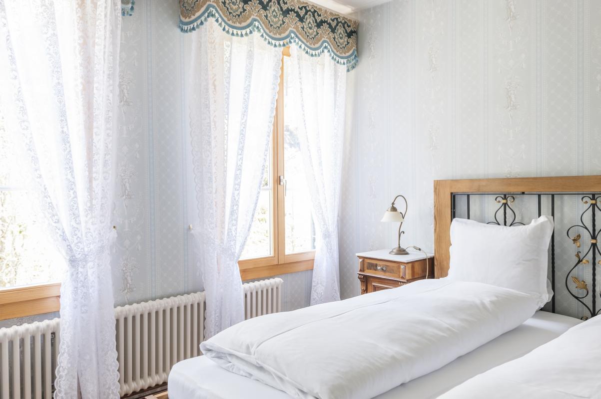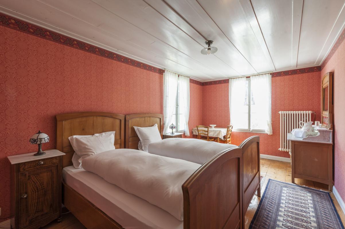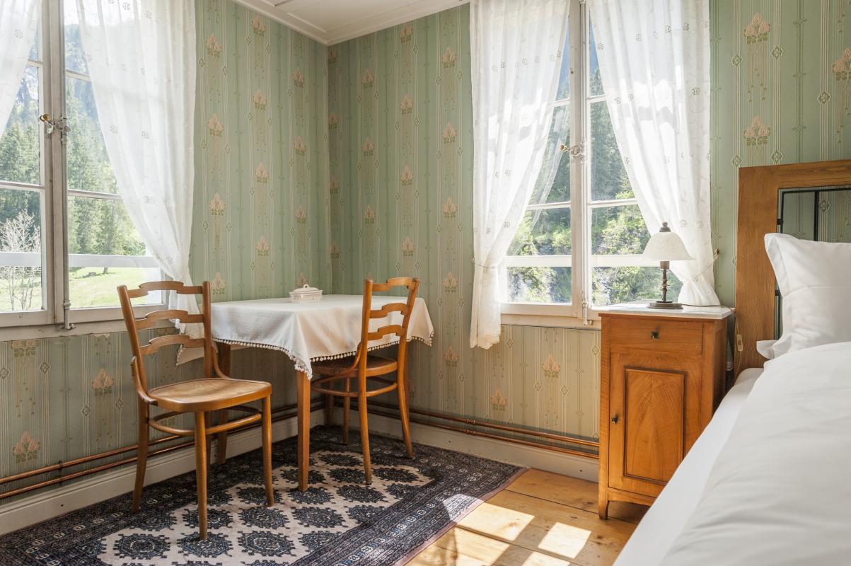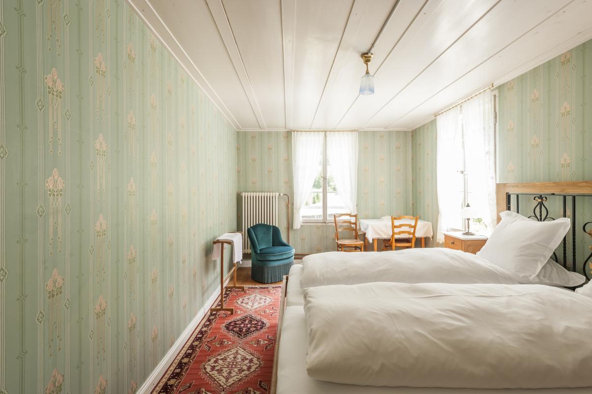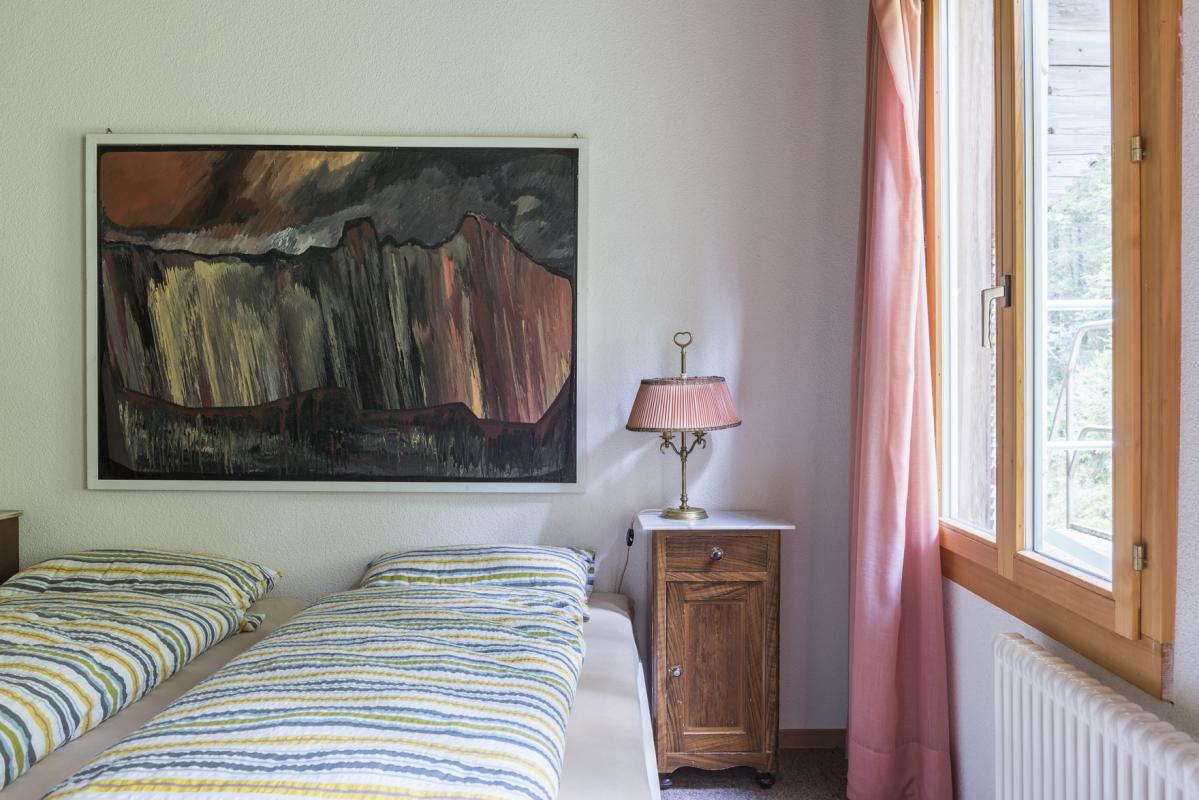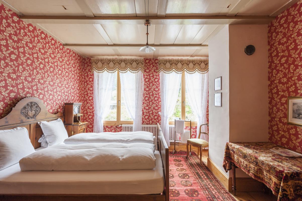 Simples chambres à deux lits sans vue sur les montagnes. Les draps ne sont pas changés après chaque séjour, veuillez apporter votre sac de couchage ou votre sac de couchage de cabane ainsi que vos propres serviettes de douche. Les toilettes et les douches se situent à l’étage. Ces prix comprennent le repas du soir, le petit-déjeuner et une carte libre parcours pour le car postal.